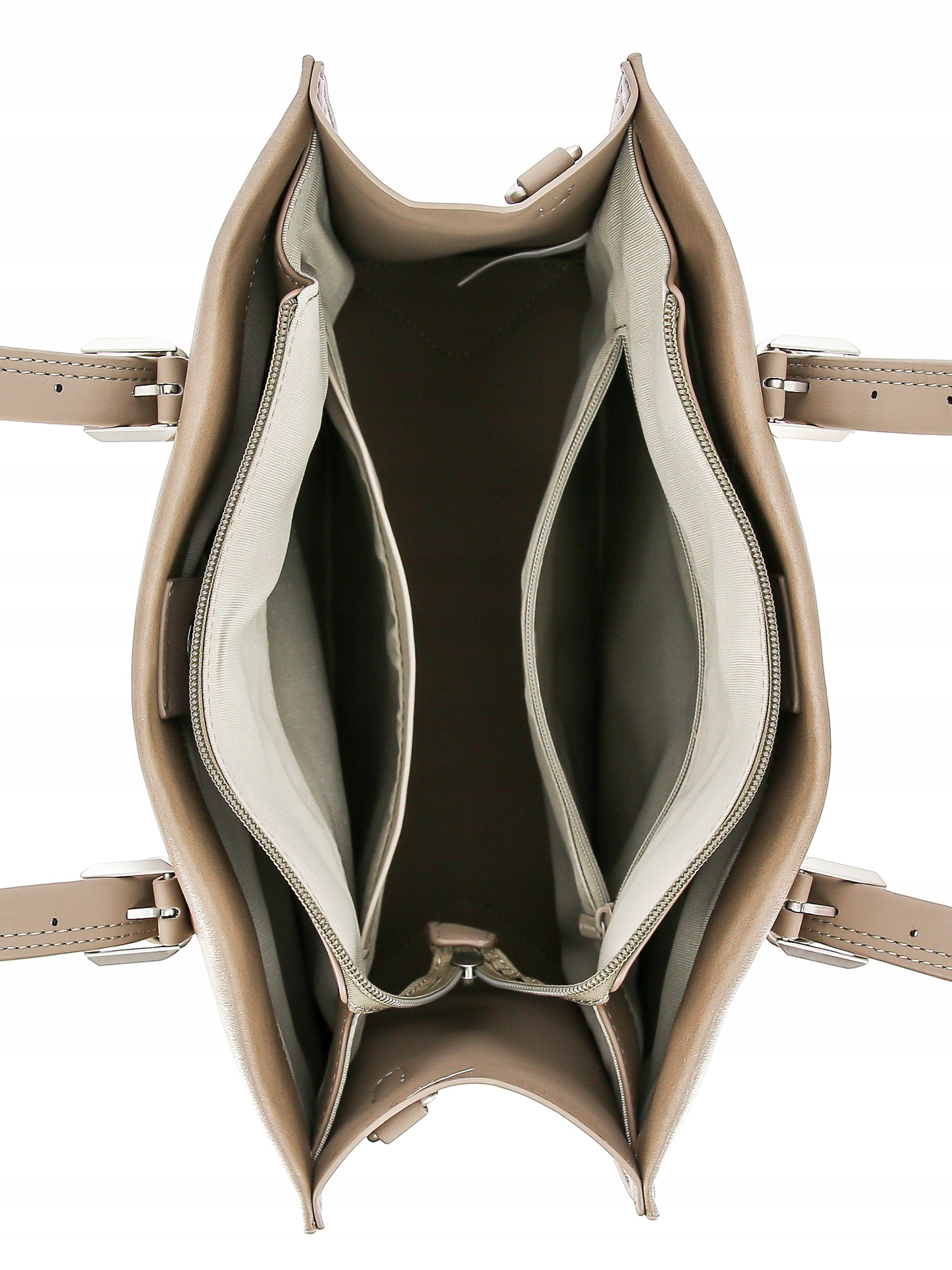 - W środku: otwarta kieszonka z przodu i kieszonka zamykana na suwak z tyłu