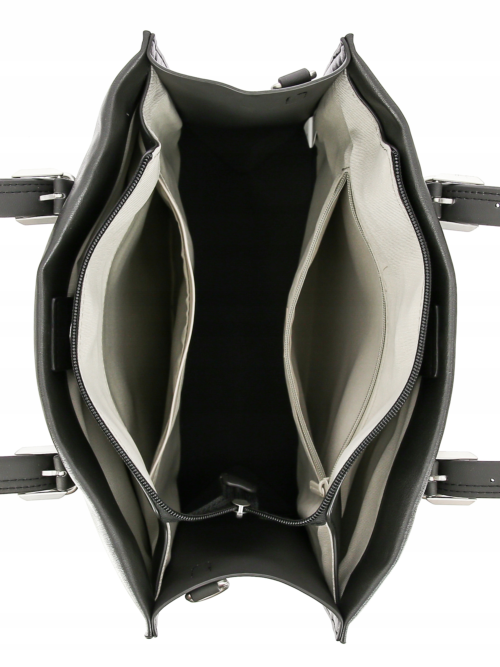 - Trzy komory: środkowa zapinana na zamek błyskawiczny, boczne zapinane na magnesy. NIE pomieści format A4