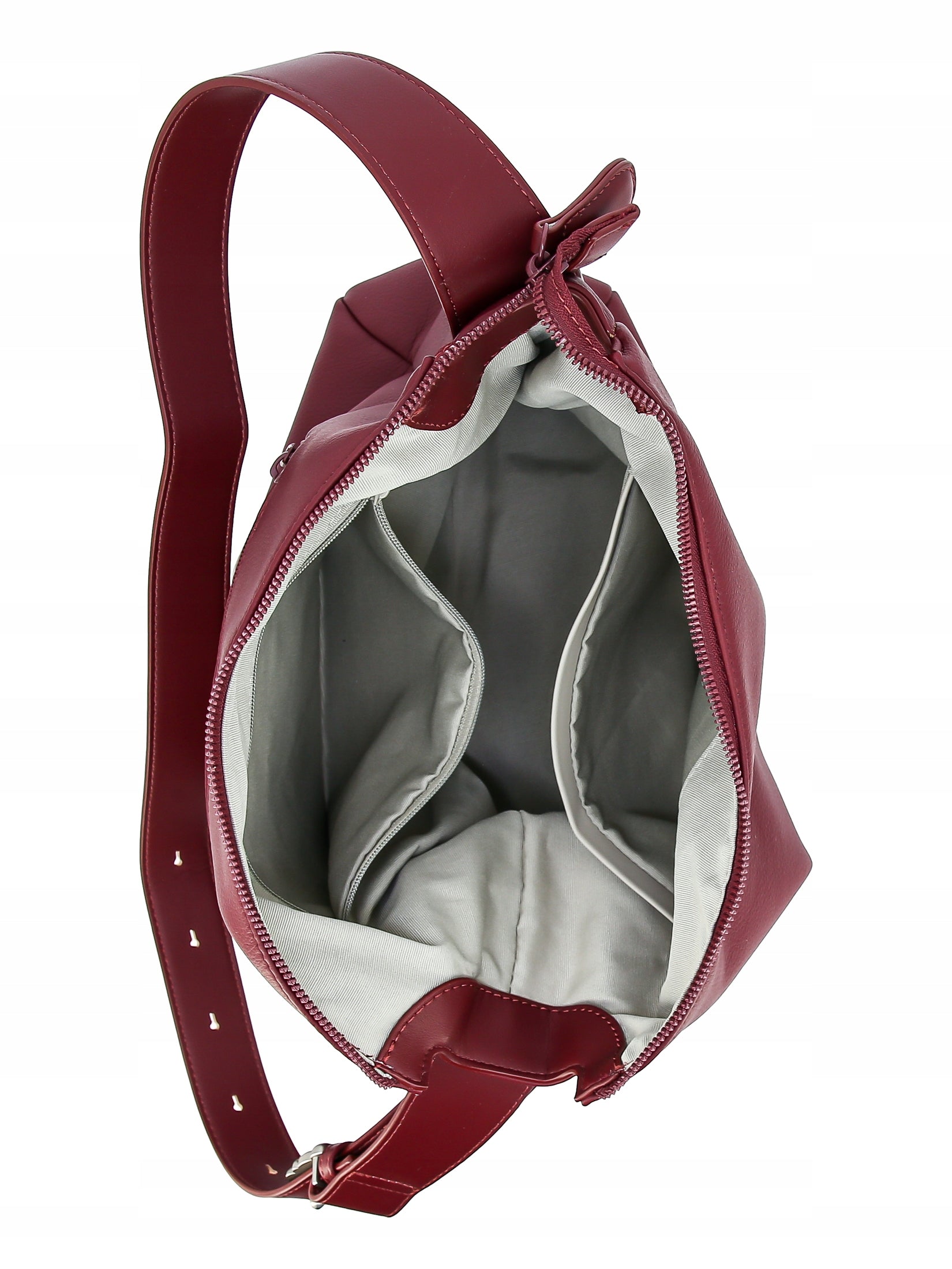 • W środku: otwarta kieszonka z przodu i kieszonka zamykana na suwak z tyłu