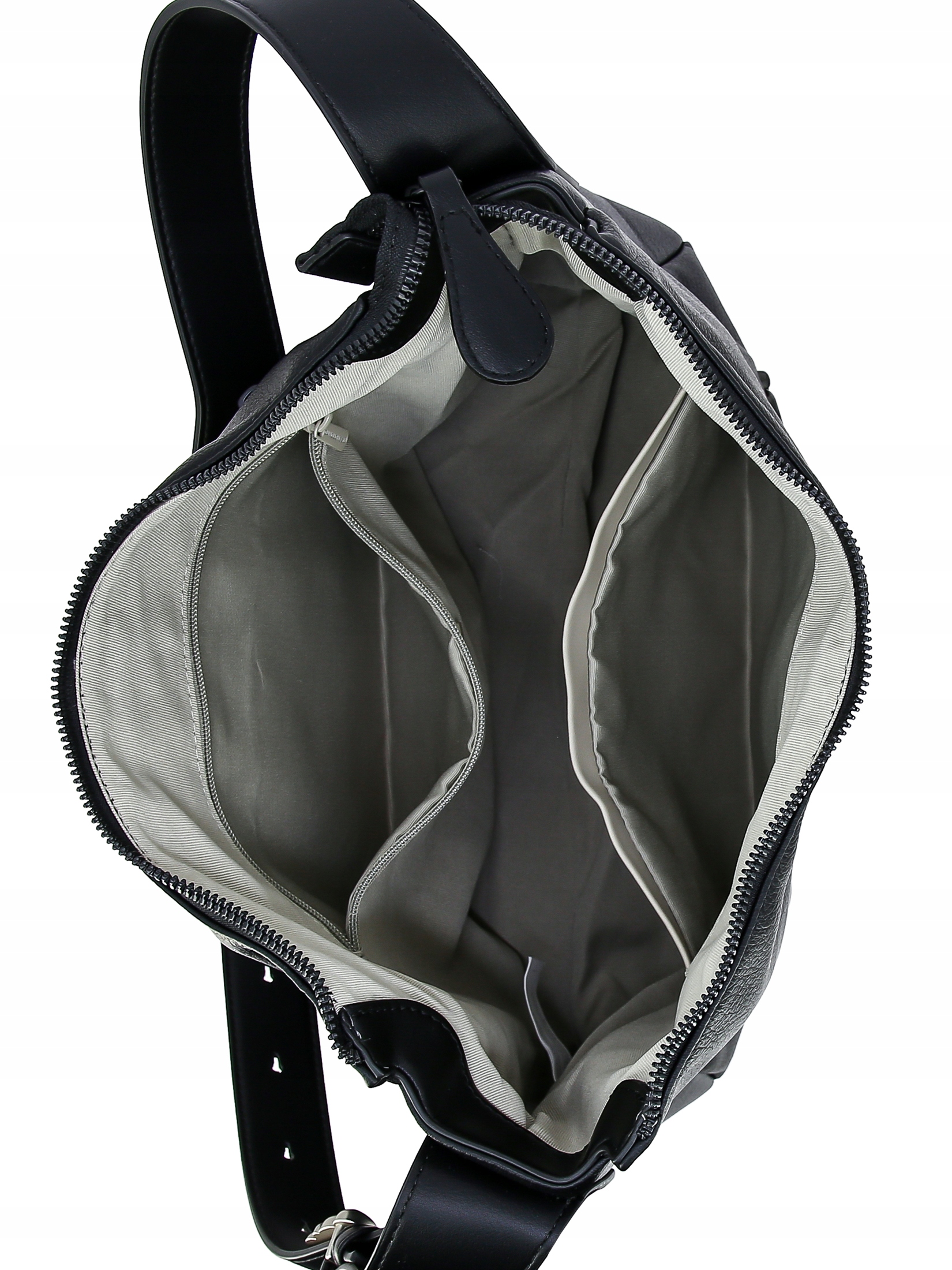 - W środku: otwarta kieszonka z przodu i kieszonka zamykana na suwak z tyłu