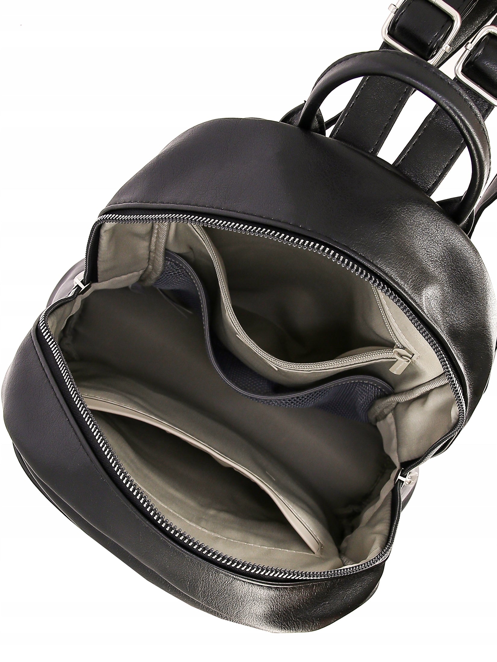 - W środku: otwarta kieszonka z przodu; otwarta kieszonka i kieszonka zamykana na suwak z tyłu
