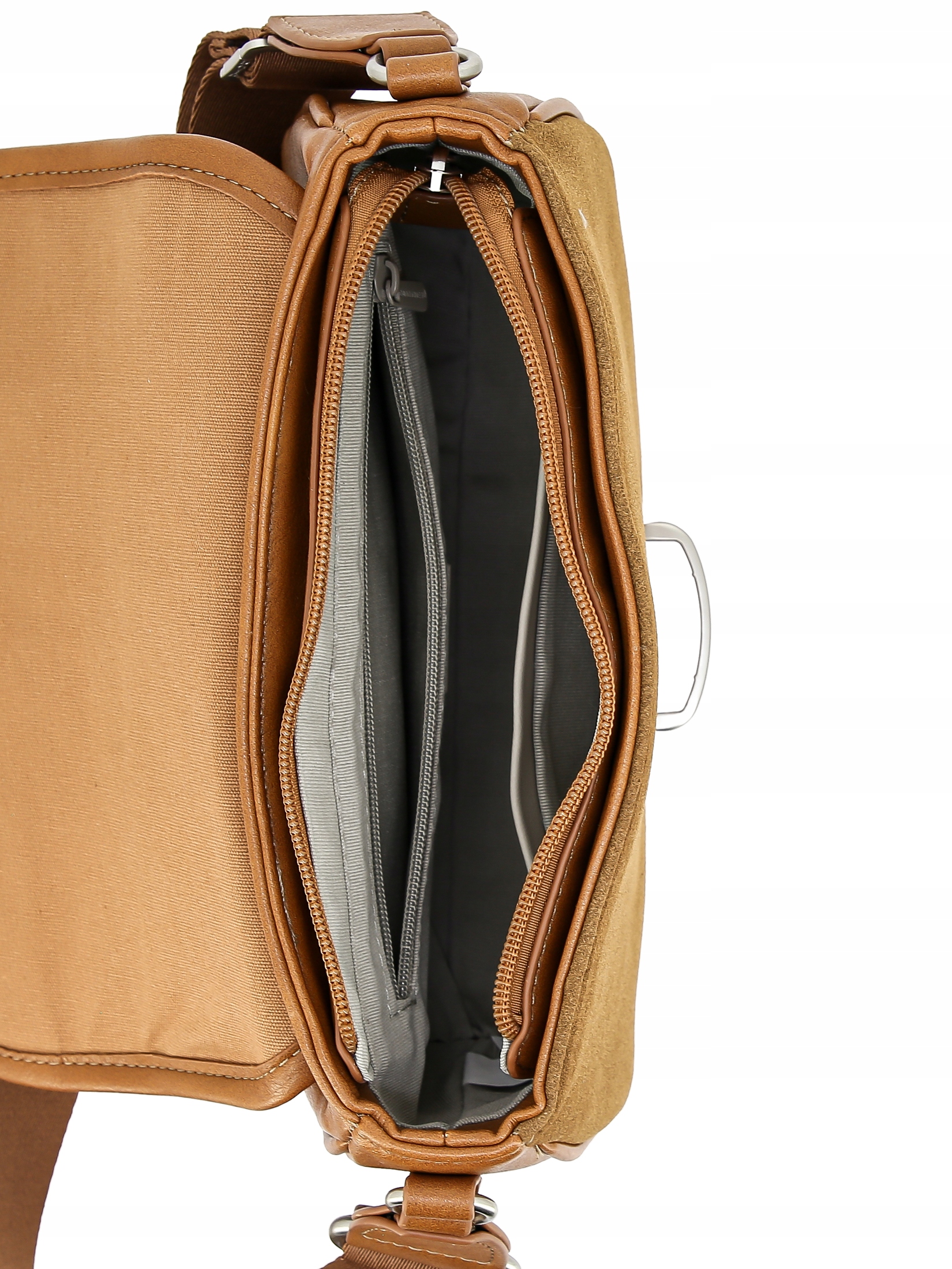 • W środku: otwarta kieszonka z przodu i kieszonka zamykana na suwak z tyłu